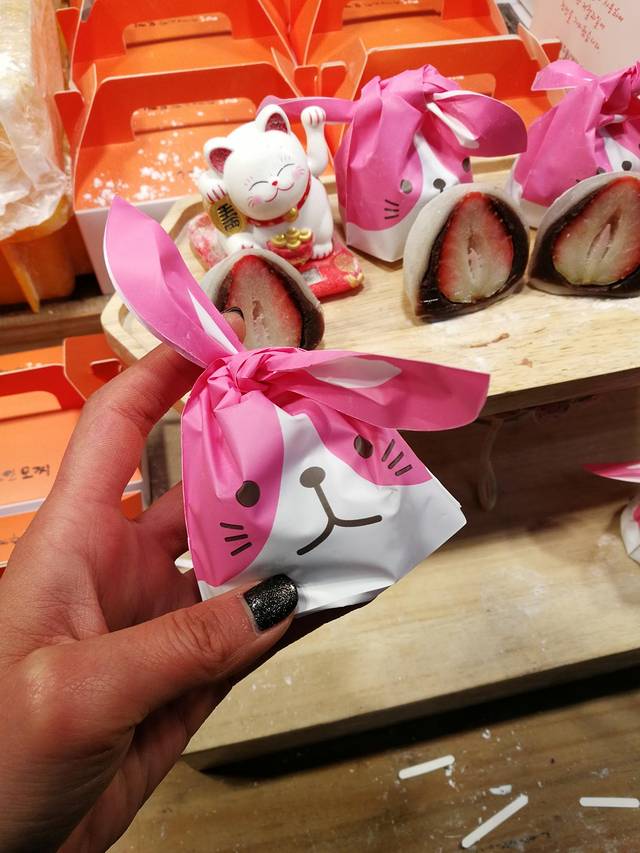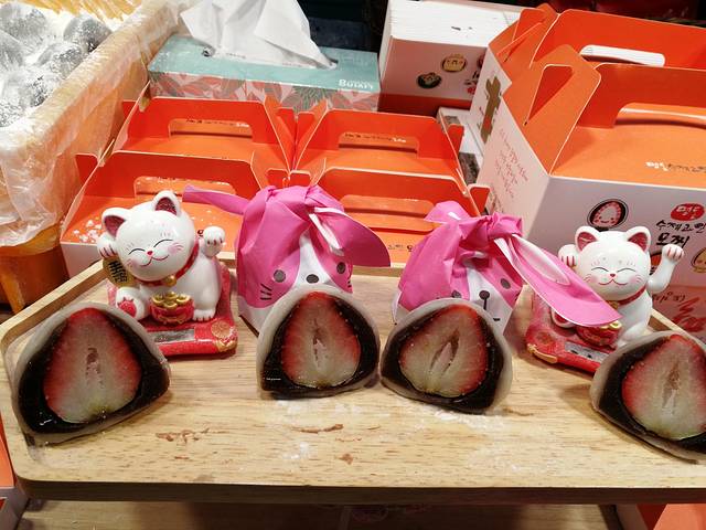 这个好好吃!大颗新鲜的草莓包裹在甜甜的豆沙中,外面再裹一层糯米团,汁多味美,值得品尝!不过价格不便宜,2500韩元一个哦~