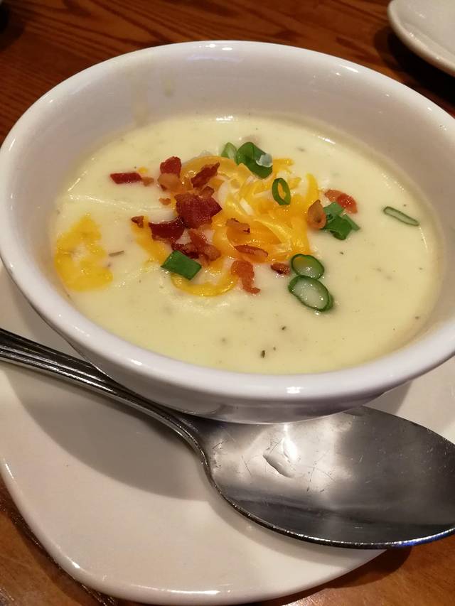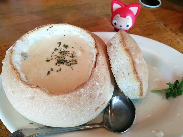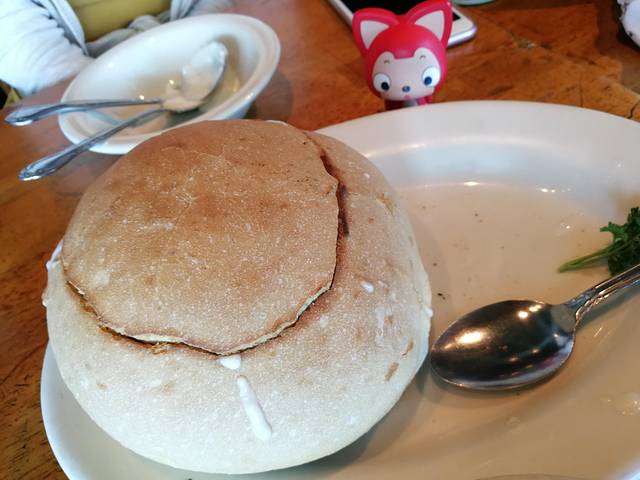 我们还点了奶油蘑菇汤,是装在面包里的,相当浓郁哦,好喝!