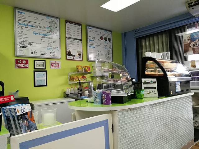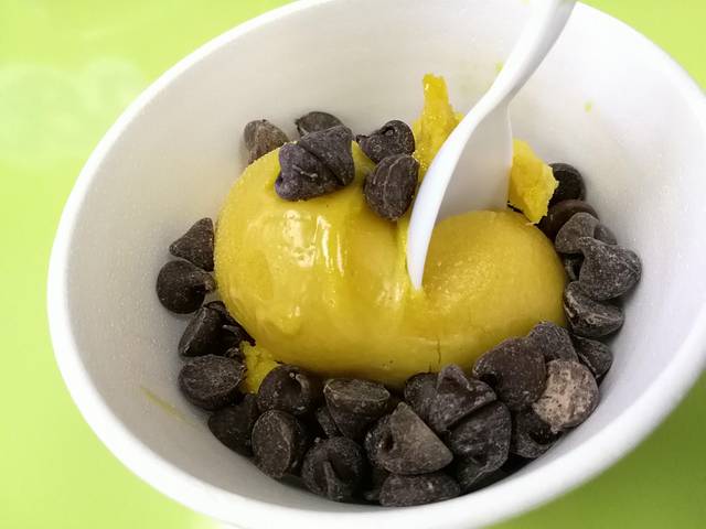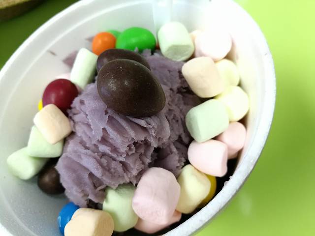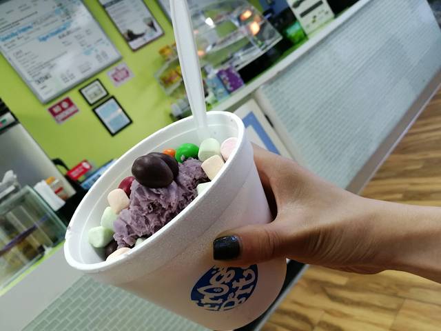 然后,小侠吃了一个不过瘾,又再去买一个,哈哈哈。前面是芒果单球,这次是蓝莓混合,小杯,还可以加两种配料!!价格是$4.75,超级满足!!