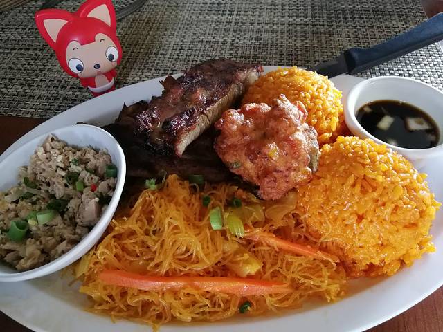 点了一份混合着烤肉鸡肉以及红饭的套餐,只要$13.08,味道和查莫洛夜市如出一辙,毕竟就是当地风味嘛!