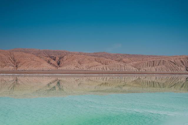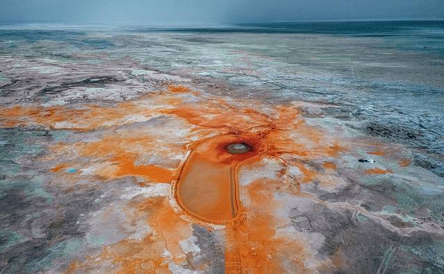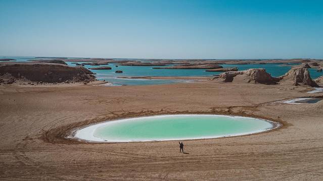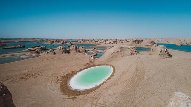湖的颜色与青海湖不同,由于含铜量较高湖水呈现出鲜绿色,岸边尽是覆盖着的白色结晶。湖的周围是大片的雅丹地貌,搭配上鲜绿色的湖水,犹如“海上舰队”。道路在湖的中间穿过,由于盐分含量极高,最好不要用手触摸。现在前往的一般只有个别自驾游和摄影爱好者才会到达,所以你来不来〜