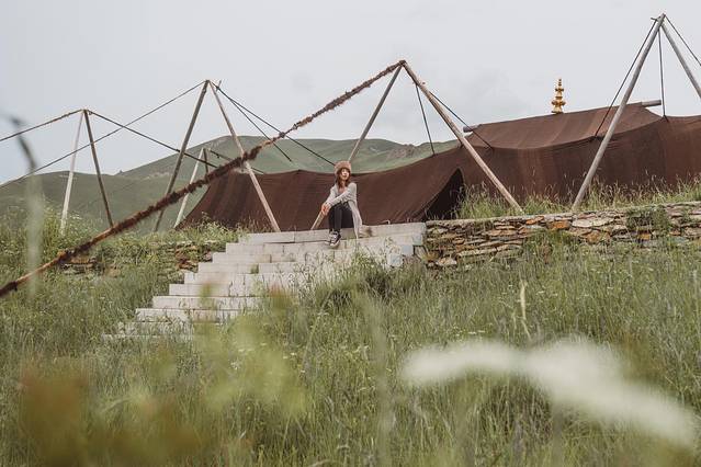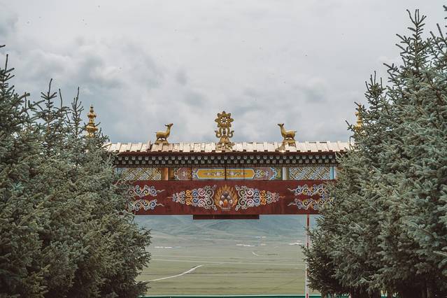 阿柔大寺位于丘陵状的草原之上,周围碧绿的草原连绵起伏很漂亮。寺院有藏族传统的庭院式建筑、大殿、金塔、转经长廊等,在建筑外面拍照十分漂亮。