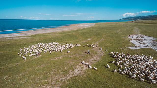 青海湖随便一处牧民湖边实现的赶羊自由