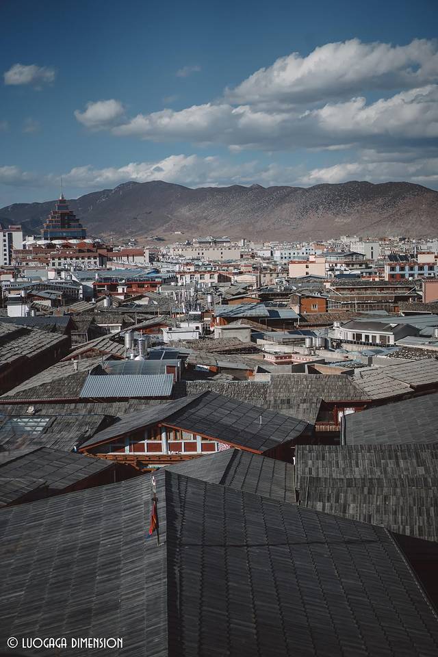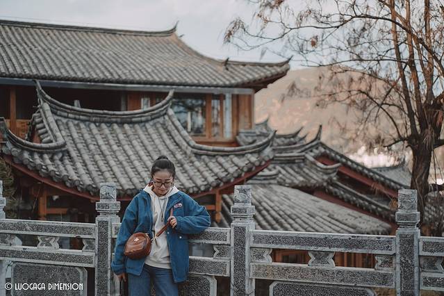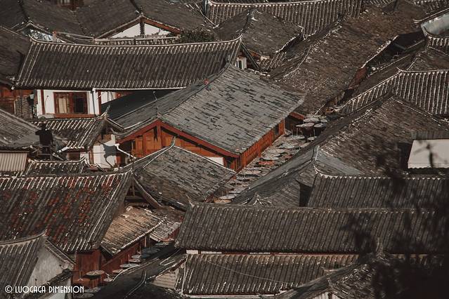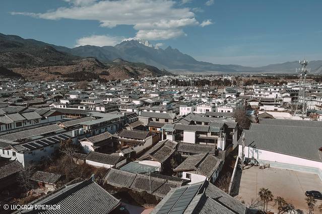 上面这张是在酒店院子里航拍的,雪山和古镇,放在一起特别和谐。束河可以用无人机,而丽江古城是在航空净空区域里,所以不能飞。
