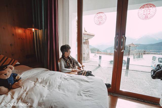 我们刚到雾浓顶的时候,的确是雾!浓!顶!,云雾很大,对面的雪山只能看到一点底部,风还很大,又冷,照片都懒得拍,躲进酒店休息,外面大致就是下图这样。