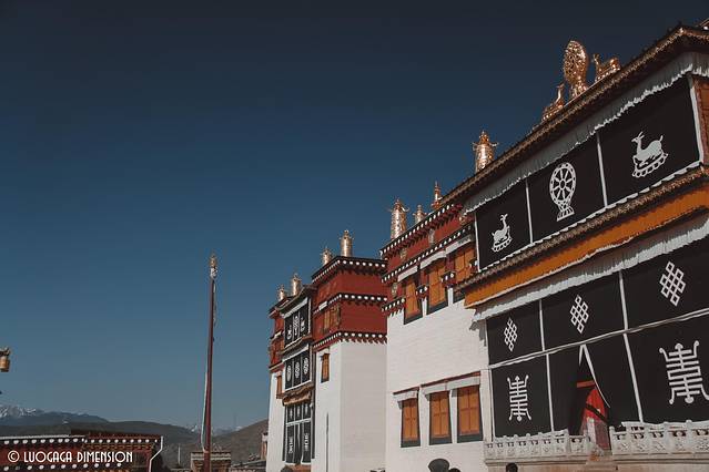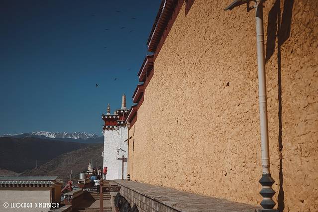 在松赞林寺可以看见远处的石卡雪山,石卡雪山被称为“莲花宝座中心”,也是香格里拉的神山,天气好的时候,可以从神山上看到多座雪山,包括梅里、哈巴、稻城亚丁群山等等。