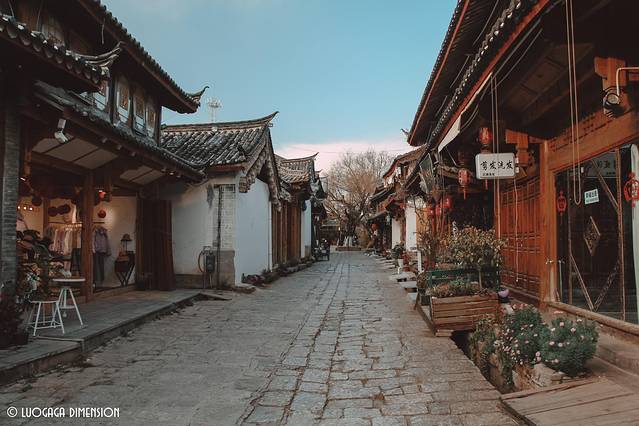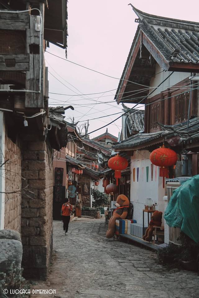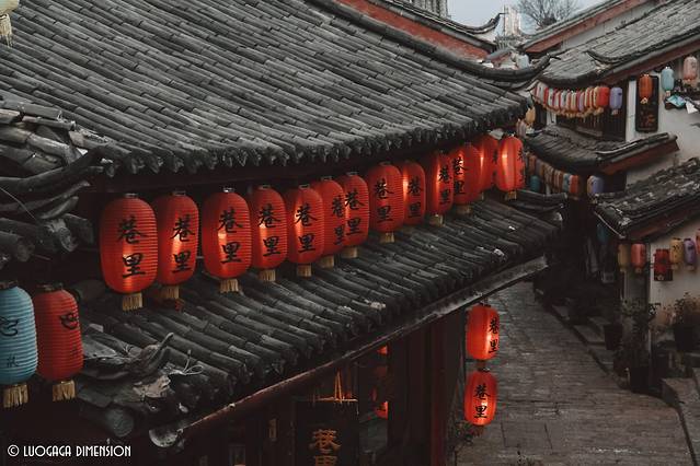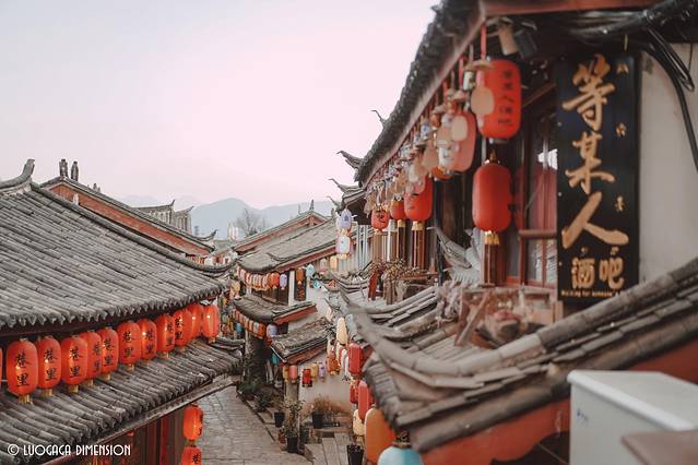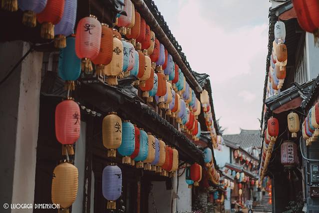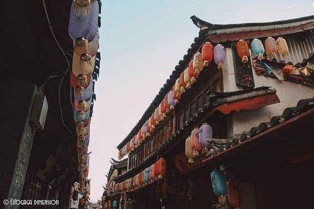 从山上俯瞰的丽江古城特别拥挤,实际来到街道中,也确实感觉很狭窄,楼房都是两层,看不通透,所以每一个转角都是惊喜,有的巷子家家户户都摆满鲜花,有的则都是灯笼,有的又都挂着伞,很梦幻,将古风演绎得淋漓尽致。
