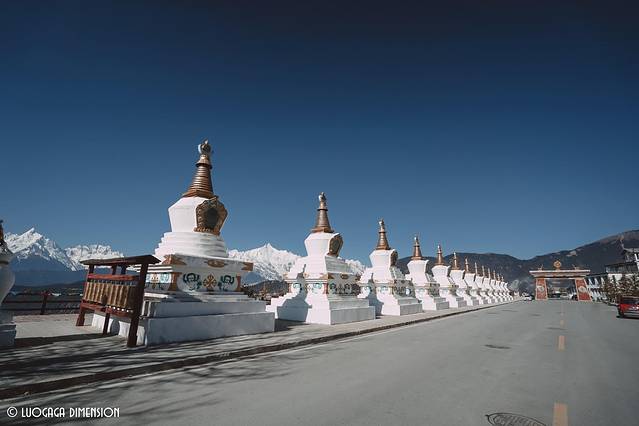 雾浓顶观景台入口立着13座白塔,象征着梅里十三峰,很有仪式感。