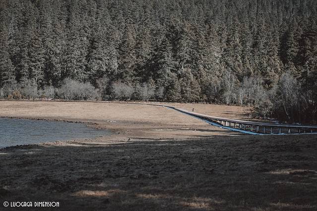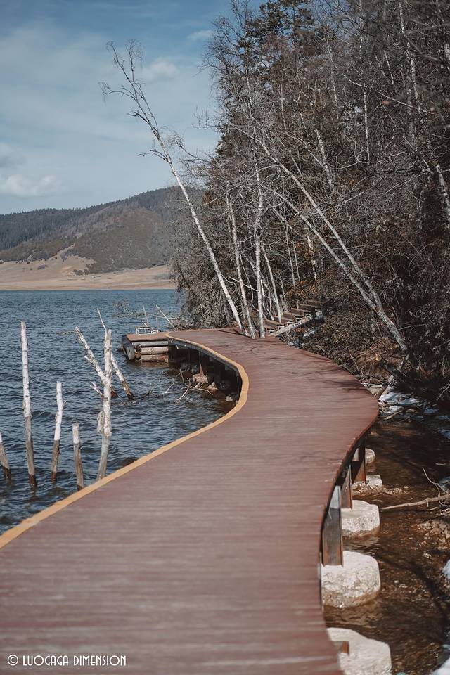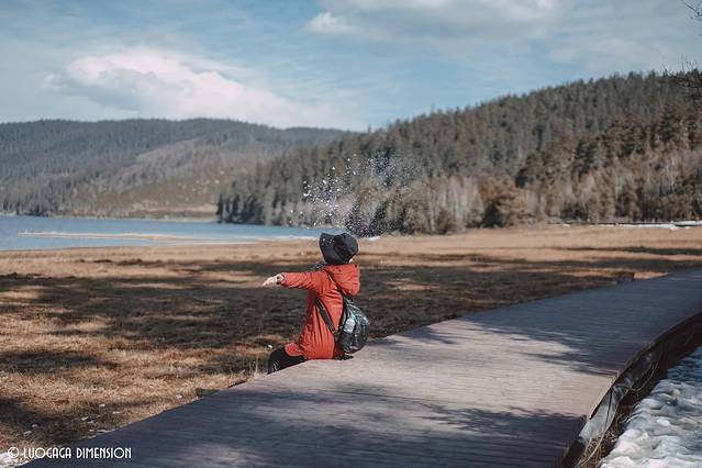 冬季的普达措有墨绿金黄、冰雪的白、湖水的蓝,行走在湖滨栈道,感受山水间宁静的美。