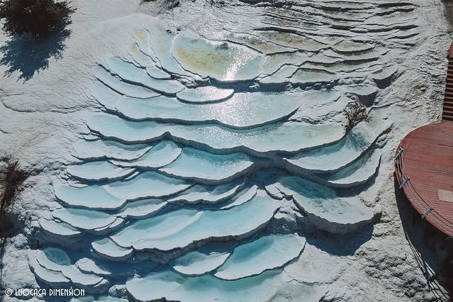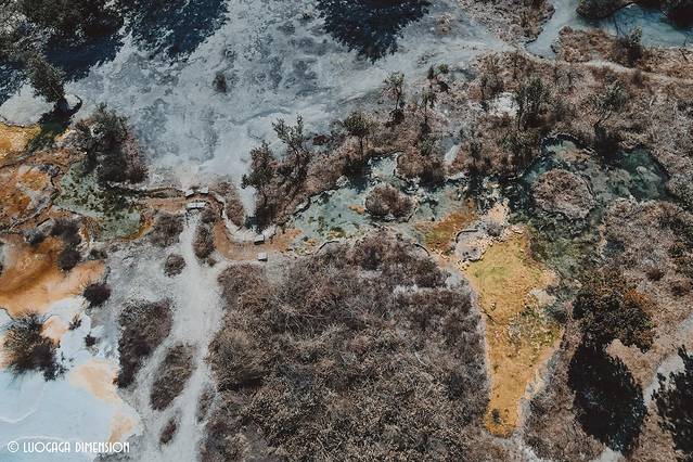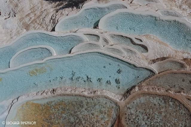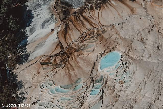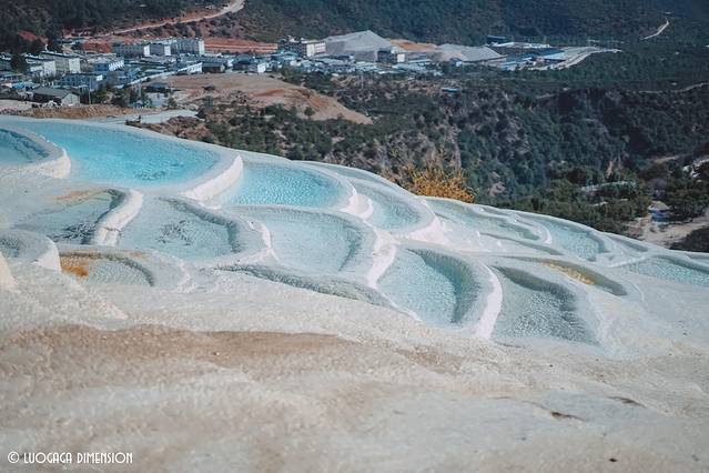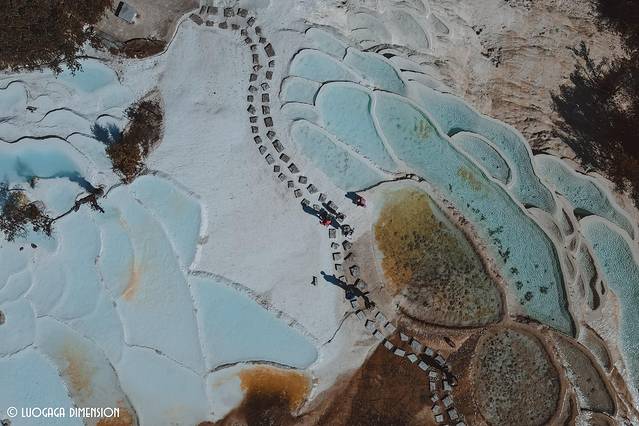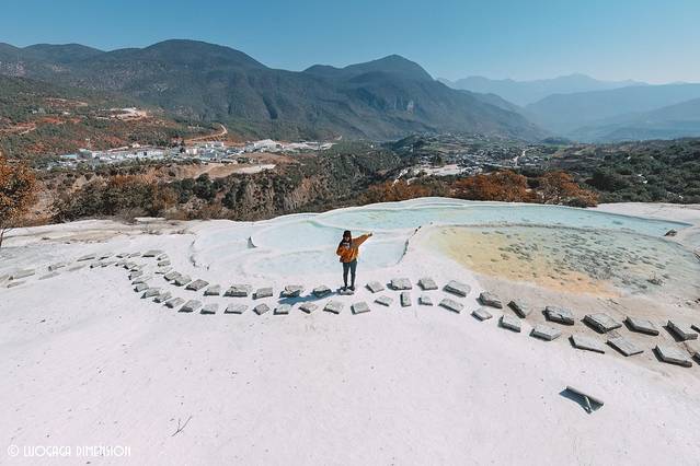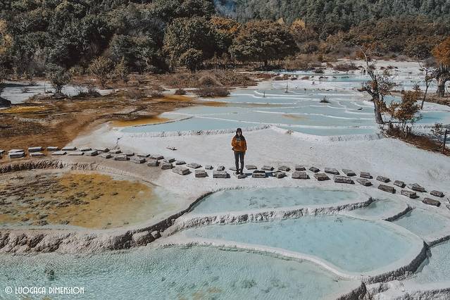 有的博主说开车这么久就为看个这个不值得,如果不带飞机确实不太值,有航拍会精彩很多。白水台的面积很大,经常看到拿它跟黄龙作对比,黄龙是长,白水台是宽,颜色很好看,白色的岩石、蓝色的绿色的水,在蓝天白云映照下特别梦幻。
