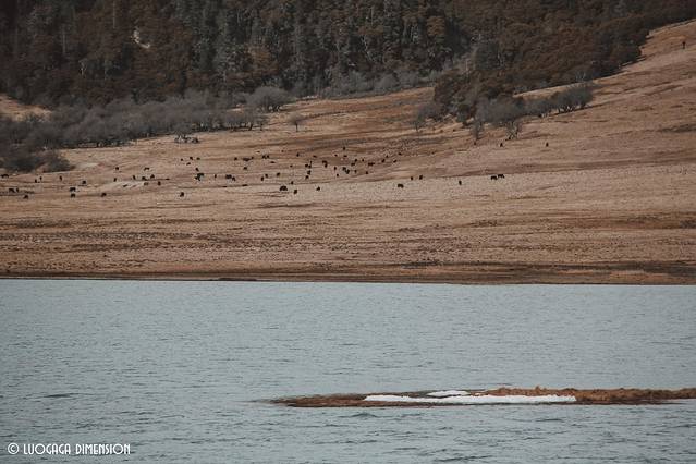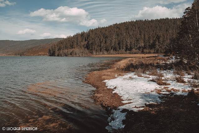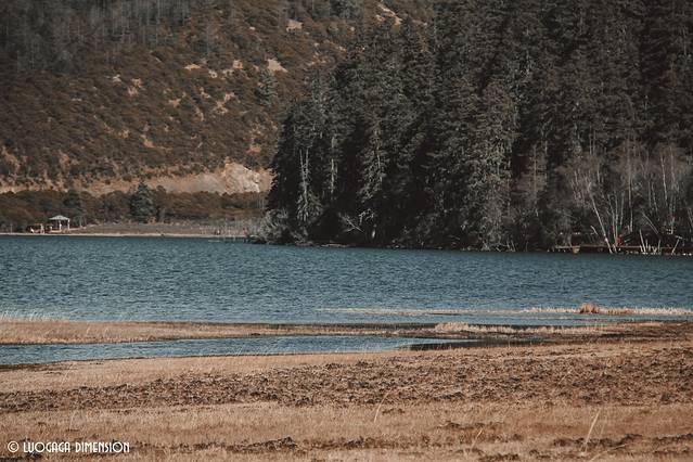 冬季的属都湖,湖畔草甸都是金黄色,跟山上郁郁葱葱的墨绿色原始植被放在一起呈现一种很舒服的颜色搭配。