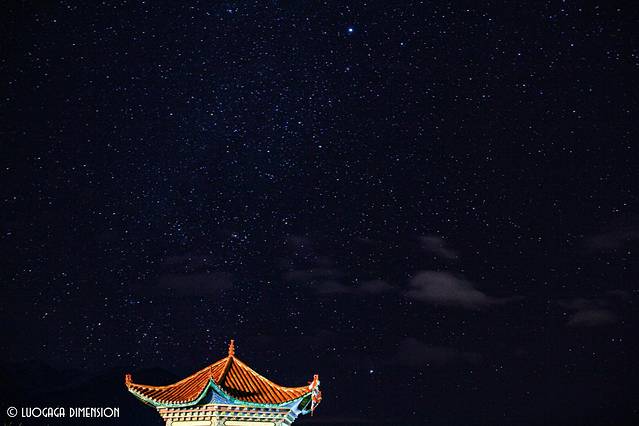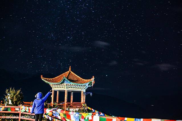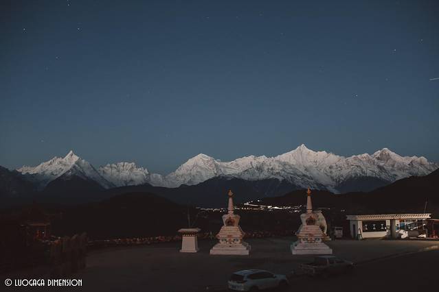 我跟我爸一起扛着相机到观景台拍星星,同时准备试着用相机长曝光拍一下雪山的方向,再暗,相机也是强大的,虽然只有十分微弱的光线,我们最终还是看到了黑暗中卡瓦格博的轮廓,瞬间欣喜若狂,雪山出来了!