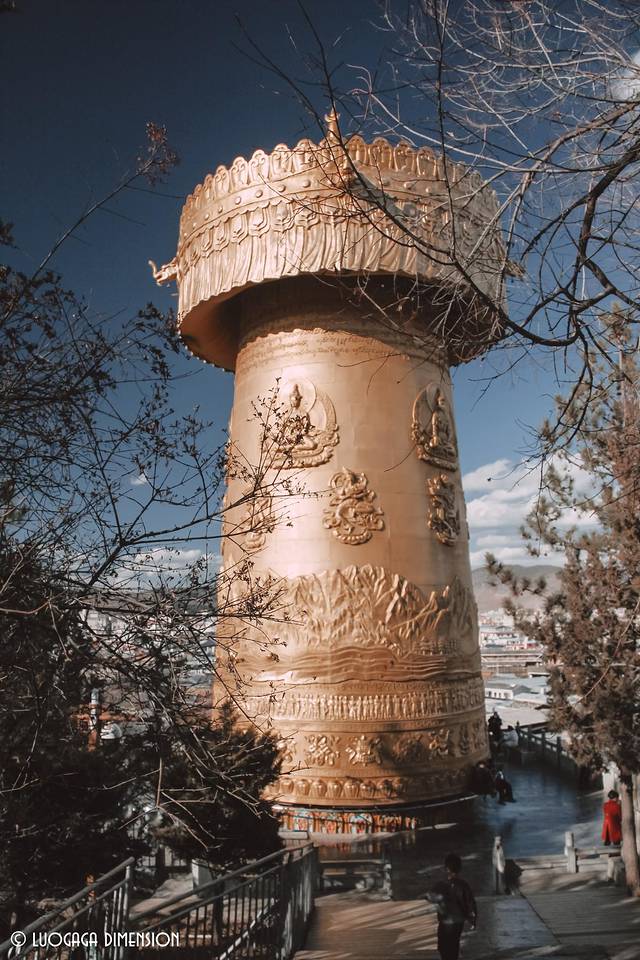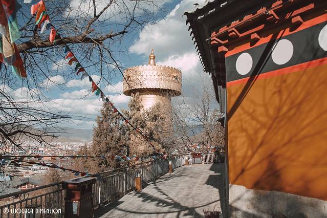 独克宗古城一端是龟山公园,从龟山公园上可以看独克宗的全景,山上坐落着大佛寺,是传统的藏传佛教寺庙样式,还有目前全世界最大的转经筒。