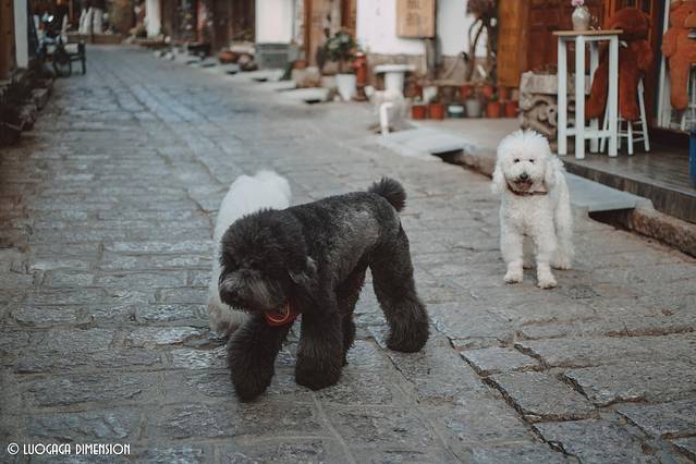 从奶茶店的巷子出来,遇见了拦路的三只巨贵,其中的“大黑”(这是我根据毛色随便起的名字)看见我们就冲过来蹭,粘人且可爱,这三只狗也是旁边某网红民宿的,此时此刻,觉得束河的氛围真的太好了!