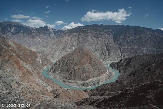 金沙江一直伴随着214,在奔子栏遇上大山拦路,形成了一个大拐弯,这里又叫金沙江第一湾,是云南和四川的分界线,一边是迪庆德钦县奔子栏镇,另一岸则是四川省甘孜州得荣县。