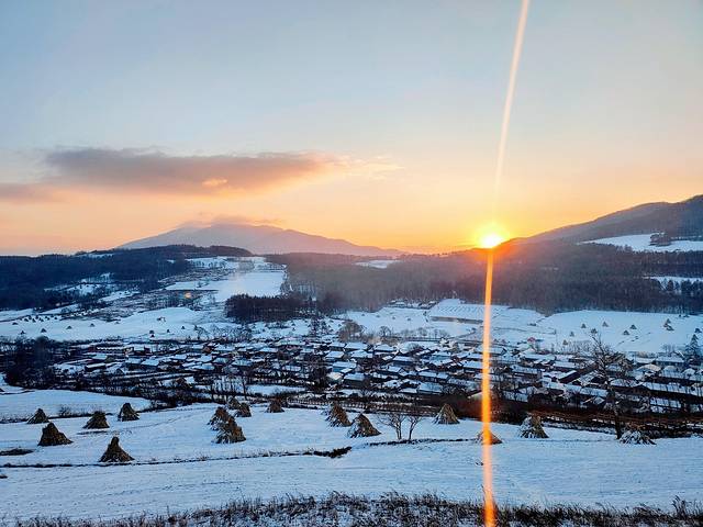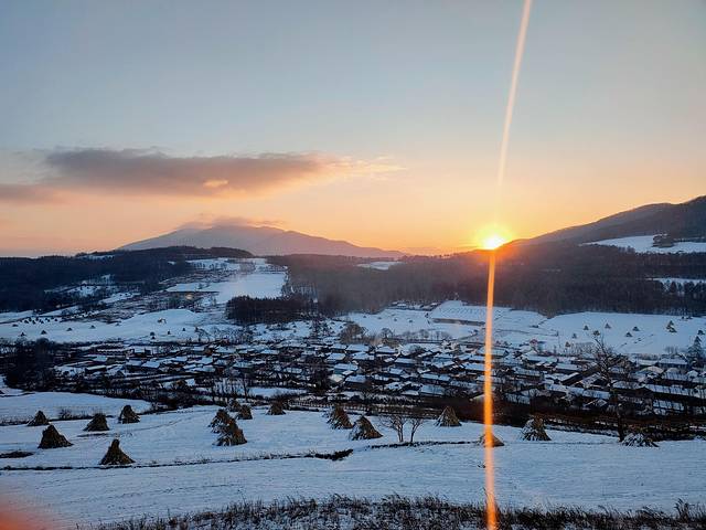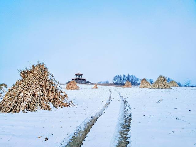 本来想着在街道走走寻找上山的路线,这时看到一户人家旁边一条小路就走了上去,在深一脚浅一脚的雪堆里前行,只是认准了目标山上的凉亭,经过田野的洗礼后终于爬了上去,时间刚刚好太阳还未升起。