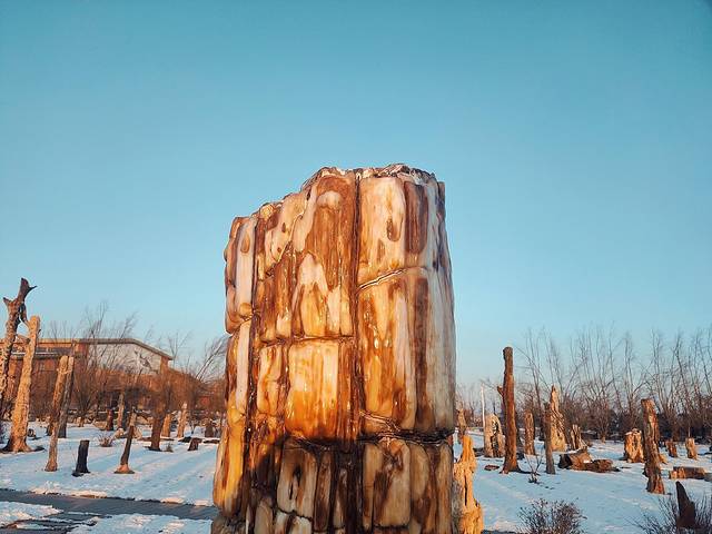 接着我们走到了室外最大的一片树化石林,这些来自各国的树化石屹立在洁白雪地上。
