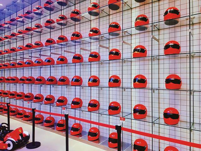 对啦、对啦,还有这一整面墙的赛车头盔墙和两辆赛车,真的很霸气!