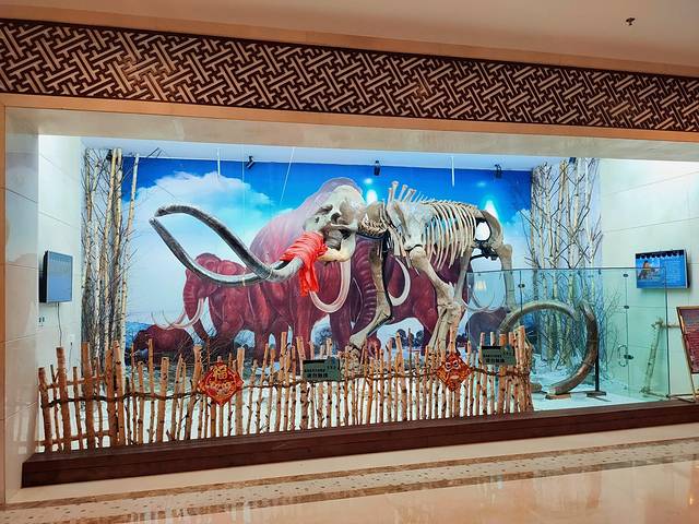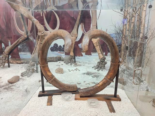 首先在大堂内要参观的是“猛犸象象牙化石”,这是当初在修建养老公寓时挖地基发现的,但由于地基建好,所以只发掘象牙出土了。