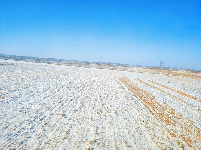 ▼随着列车前行车窗外农田被厚厚的积雪所覆盖