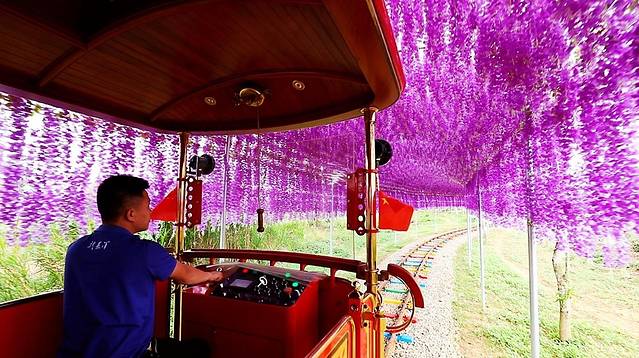 伴随着小火车的缓缓旅途,驶入紫藤花长廊,“紫藤挂云木,花蔓宜阳春。密叶隐歌鸟,香风留美人。”美诗美景迎面扑来,构筑着最美丽灿烂的时空隧道。