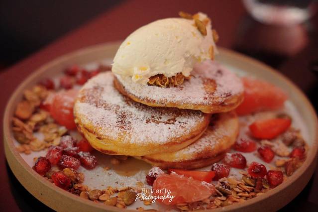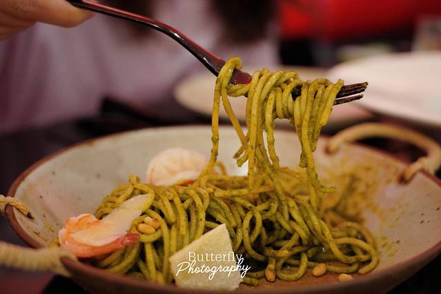 炼乳霉果松饼,颜值真的很高,松饼咬上去糯糯的,搭配一点冰淇淋,口感层次很丰富。鲜虾罗勒意面,是我喜欢的口味,面条吃起来很清爽,颜值也很高。