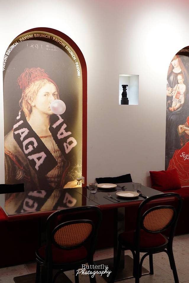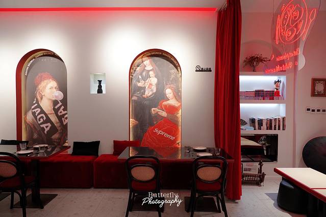 这家餐厅主打的是中世纪意大利歌剧院的装修风格,以饱满的深红色为主要基调,墙上有各种搞怪的绘画,怎么摆造型都很好看。入门的书架、墙面的壁画、桌面的艺术品,随处可见的高级感。