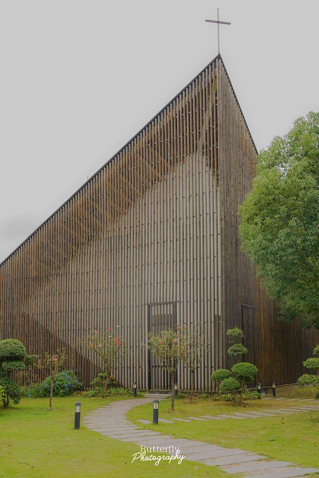 万景园位教堂外形虽是平和的方形但极有魅力和特色。由两个相交的三角形体量组成“蝶形”的屋顶造型。竖向的木质格栅几乎成为立面的唯一元素,让教堂呈现非常简洁单纯的形象,配上屋顶的黑色木瓦,显得精致而富有层次,在水中倒影的映衬下体现出内敛平和的东方气质。