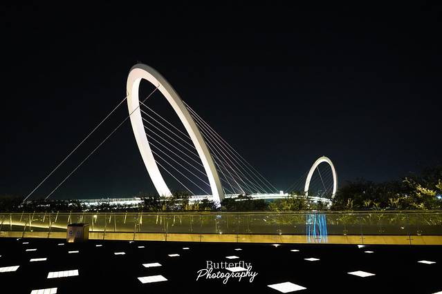 南京眼步行桥的夜晚实在太美了,整座大桥外观造型简洁飘逸,两个白环既相对又似分离,动感极强。桥身似泛起的涟漪,由宽渐窄,由窄渐宽,行人穿行其间犹如琴弦上跳跃流动的音符。