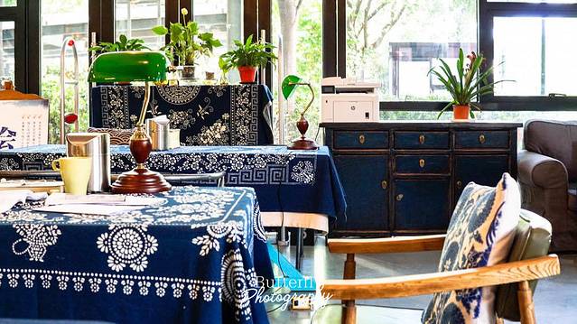 青花瓷的桌布、木质的桌椅、半卷的竹帘、翡翠绿的台灯、墙上挂着诗和画,书柜里是精致的藏品。