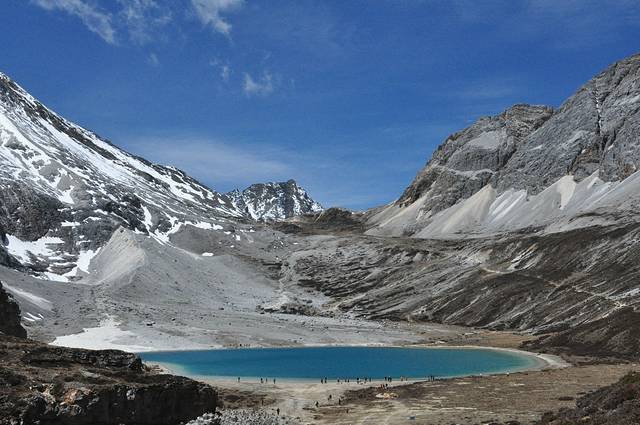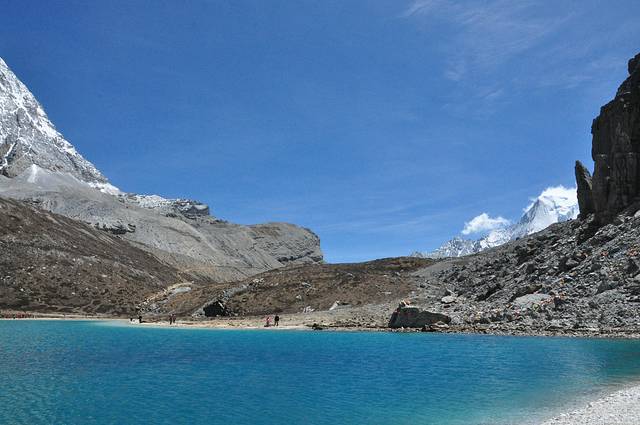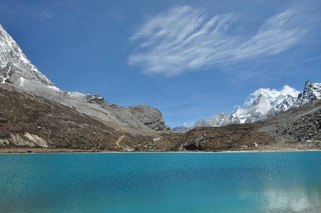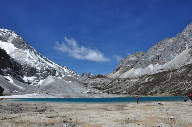 湖泊形状象一滴眼泪,站在高处向下看,她就像一块纯净的蓝松石嵌在雪山群峰中,神圣而美丽。湖泊中间呈蓝色,四周被雪山环绕。岸边的水面略深,水下是古老植物的沉积,稍往里的湖水是浅绿色,再深处便是碧蓝色,蓝得透亮。微风吹动水面,阳光透过云层的折射在水面上闪烁,湖泊如宝石般变幻着光彩,时而深沉,时而耀眼,飘忽不定。