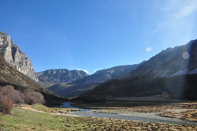 央迈勇神山形似文殊菩萨手中的智慧之剑直指苍穹,冰清玉洁傲立于苍穹之下。雪峰下宽阔的峡谷间,森林、草地、溪流和睦地融合在一起,一派气势莽莽又娴静温柔的景象跃然眼前。1928年,美国探险家约瑟夫·洛克先生在稻城的崇山峻岭中,远远望见央迈勇,被她圣洁、高贵的气质所折服,他在日记中写到:“她(央迈勇)是我见到的世界上最美的山峰。”如果你站在央迈勇的山脚下,转身向后望去,冰清玉洁的央迈勇傲然立于天地之间,周围群山环绕着宽阔的峡谷,森林、草地、溪流各守一方,如此祥和宁静的美景,不正是香格里拉所在的仙境么?