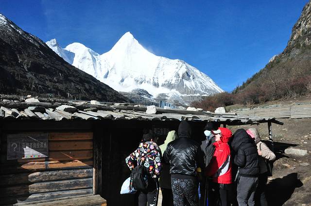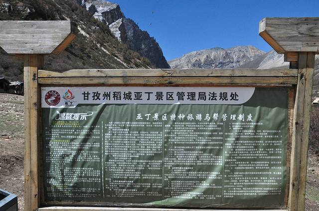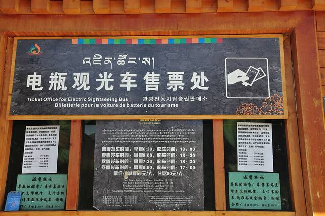 7点吃过早饭,就在酒店外的马路边等景观车。景区景观车分两种,一种是游客中心发往景区,到达时间要一个小时之后。再一种就是我们等待的亚丁村发往冲古寺的车,每天最早7点半左右运行。我们等车的位置在4号停车点,也就是说,前面还有3个停车点,如果游客坐满,还要等下一班。也不知当天人那么多,果然第一班下来已经无座,而且仅我们酒店等候的游客将近拉满一车。第二班过来,我们早早的到车前,还好上车有座。8点10分到达冲古寺,下车走10几分钟,来到电瓶车售票处,还没有开始售票,等了一会,工作人员过来,我们基本上赶上第一班电瓶车。电瓶车票价每人往返80元,这个必须要买,一个是往返将近30公里,根本走不下来,更何况是在海拔4000米左右的高原。二是时间也来不及,晚上还要返回稻城,领队约定的时间是下午5点在游客中心集合。