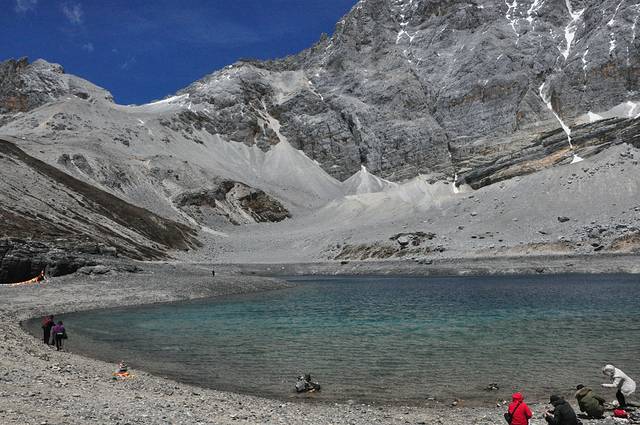 从牛奶海往回走上一个山坡,有300米的距离,是五彩海,五彩海就没有牛奶海那般亮丽,虽说五彩,但因其颜色暗淡,湖面又小,未免相形见绌。在湖边的山坡上,我们解决了所带的食物,然后开始下山,从五彩海下来的路是走另外一条,非常陡,而且原始,现在正在铺修栈道,这条路上来时最好别走,那会更加艰难。此刻,也正是游客上山的高峰,本来就十分狭窄陡峭的山路,挤满了人。我们算是第一批游客,下山时已经下午1点,到达上山下马处是1点半,下面的路已是平道,较为好走。3点坐上电瓶车,3点20到达冲古寺,3点半坐上回游客中心的大巴车,4点半到达游客中心。到游客中心首先看到天津的小伙,他是没有乘任何交通工具,自己走到牛奶海,只是回程时乘了电瓶车,而且行李还存在大自然酒店里,其速度够快,令人佩服。最晚回来的是北京的那对夫妇,到达集合地点已是下午5点半,我们整整等了他们一个小时。他们确实已经达到体力的极限,女的骑马上山,没有带吃的和水,男的因为体重超重,不让骑马,根本就没上。
