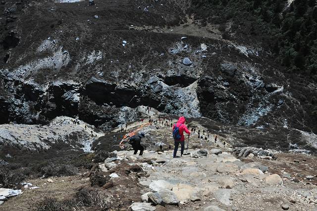 有数百米,走到骡马骑行处,如果骑马的游客可以在此登记购票,每人单程300元,往返500元。我们不打算骑马,准备走完全程,所以未在此停留。但凡有过经验的游客不会选择骑马,因为骑马行走的路线与步行完全一致,道路基本平坦,不需要攀爬山道。只不过是在马上省了步行的脚力,如果体力允许,还是选择步行为佳,因为沿途可以自由停留观景照相。另外,当到达真正上山的陡路,也是骑马者的终点,谁也少不了这1.8公里的最为艰难的路程,都是原始的石头路,稍不小心就会滑倒,说不定会跌下深谷,许多人在此望而却步,选择返回。这段路虽然不长,但是在高原上行走却是对人最大的考验。几乎每走几步,就要停下来喘气休息,耗费相当大的体力。我们是从上午9点开始步行,到达牛奶海时11点半,整整走了2个半小时。