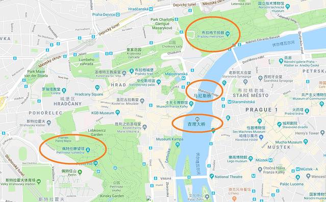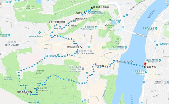 推荐游览路线:黄金巷 → 达利博尔塔监狱 → 圣乔治修道院 → 旧皇宫 → 圣维特大教堂 → 换岗仪式 → 圣尼古拉教堂 → 佩特任瞭望塔 → 列侬墙 → 查理大桥(查理大桥塔楼登顶)