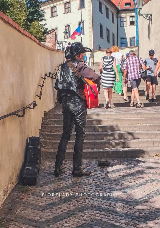 从老城区坐地铁A线到Malostranka站下,跟着人流一路拾级而上。炎炎夏日下一身黑色皮衣皮裤的吉他手正敬业的弹唱了小曲儿