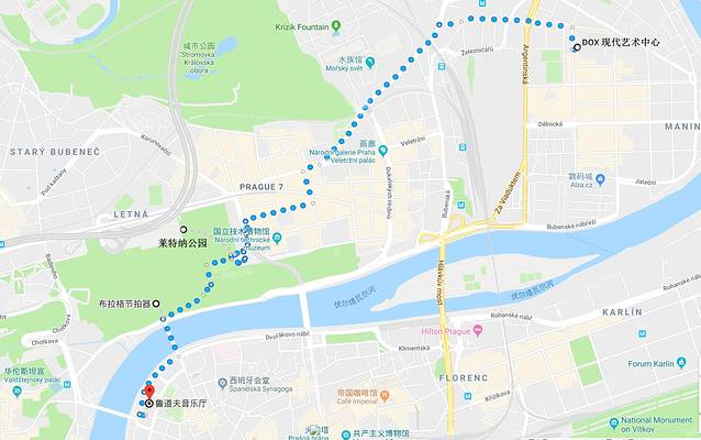 河北面:DOX现代艺术中心 → 莱特纳公园 → 布拉格节拍器 → 鲁道夫音乐厅