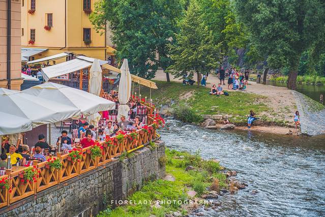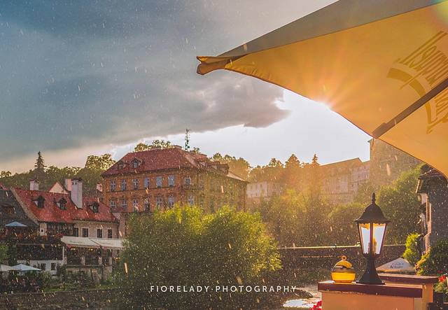 从萨尔茨堡抵达捷克克鲁姆洛夫 Cesky Krumlov小镇的傍晚,来到伏尔塔瓦河岸的餐厅,边品美食边欣赏这场奇妙的太阳雨