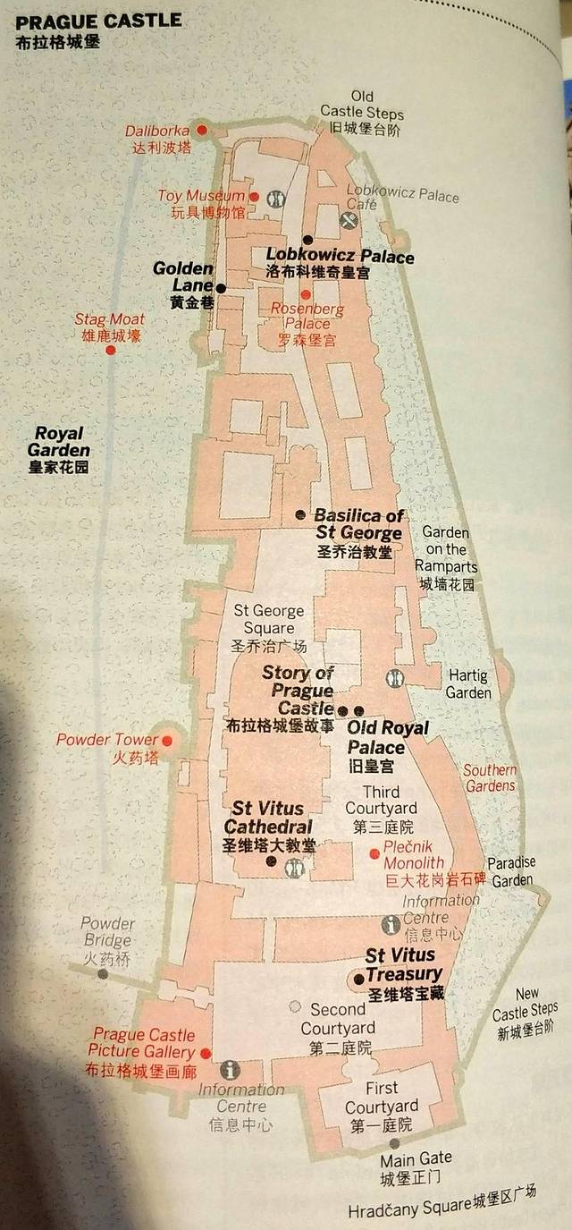城堡区包含的景点较多,主要有:圣维特大教堂、圣乔治教堂、旧皇宫、黄金巷、 布拉格城堡画廊等,我的路线是反过来走的,即从城堡的后门进入,正门出,具体路线为:黄金巷 → 圣乔治修道院 → 旧皇宫 → 圣维特大教堂