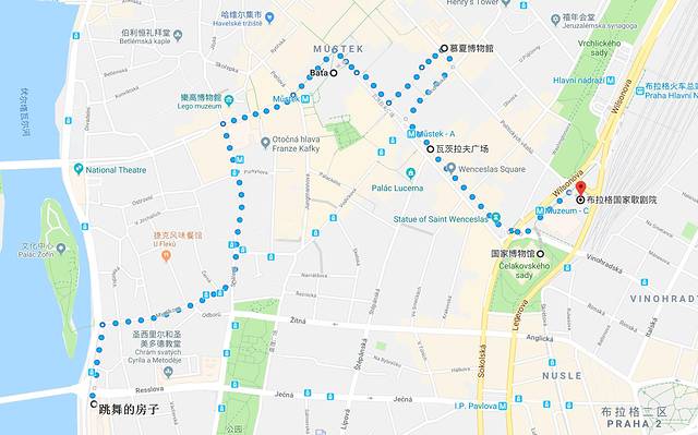 河东面:跳舞的房子 → 穆夏博物馆 → Bata瓦茨拉夫广场总店 → 瓦茨拉夫广场 → 国家博物馆 → 国家歌剧院
