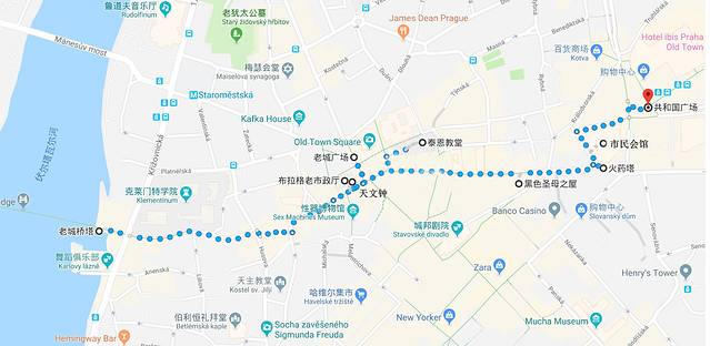 推荐游览路线:查理塔桥 → 老城广场 → 旧市政厅塔楼登顶 → 天文钟 → 泰恩教堂 → 黑色圣母之屋 → 火药塔 → 市民会馆 → 共和国广场