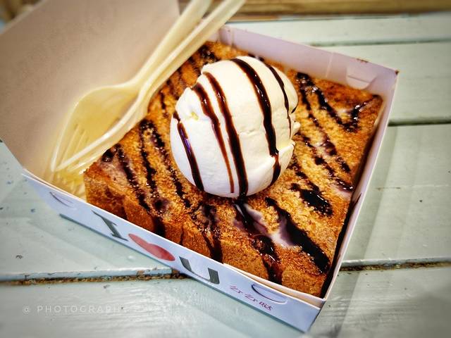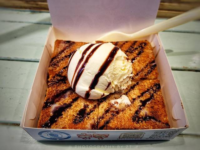 香草冰淇淋吐司,吐司烤得恰到好处,脆而软,香喷喷金黄酥脆外皮下的内心松软无比,上面的冰淇淋球,香草味很浓郁,舌尖触动到甜滑爽口的滋味。还有裹着的那一层酱,给舌尖增加了极致的体验。如果满分是5分,给这道吐司打个4.8分吧!