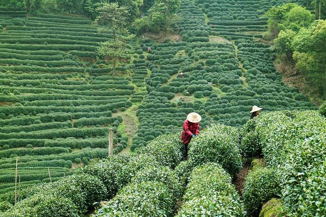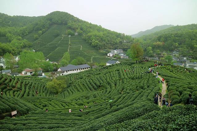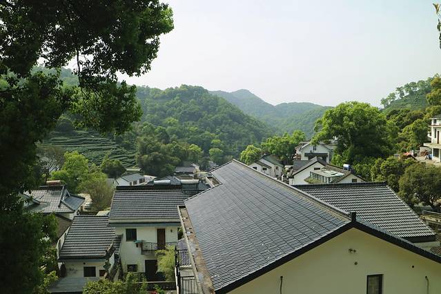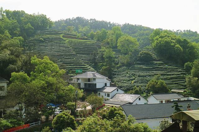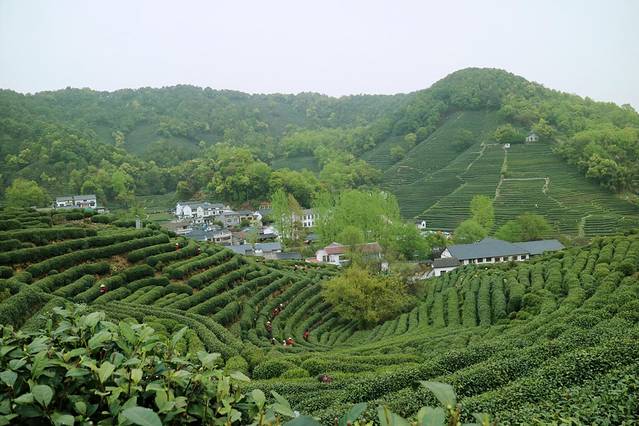 十里琅珰两边的山坡是龙井茶的主要种植区,山坡上满是层层叠叠的茶园。