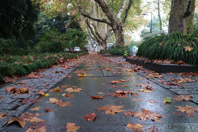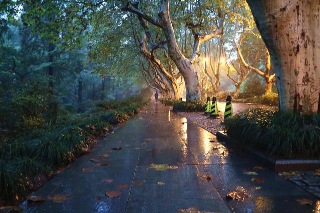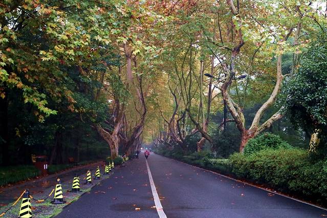 11月再来时,杨公堤的梧桐已是黄绿相间,晚天细雨,秋风叶落,比春天更美。