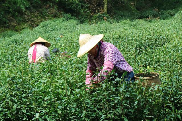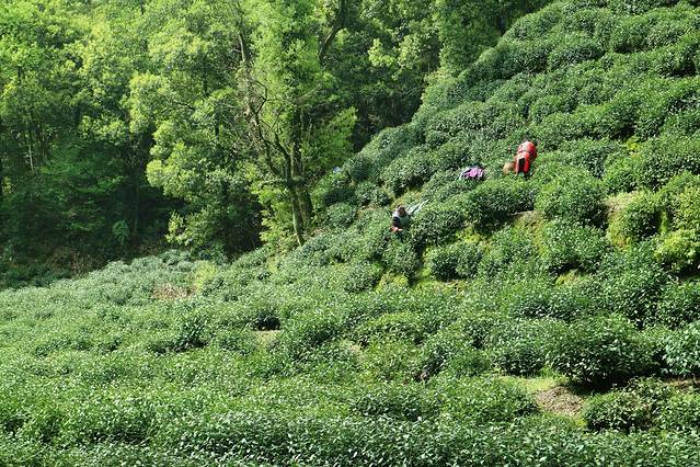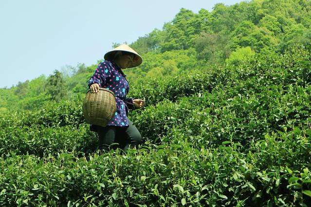 正是春茶采摘的季节,三三两两的采茶人在忙着采茶。
