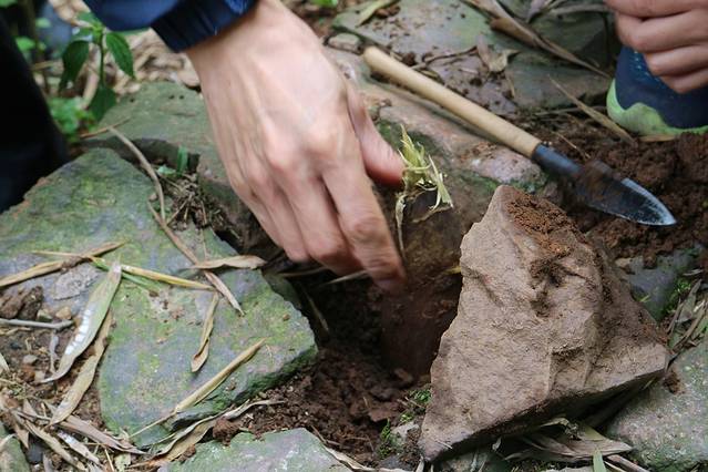 发现一棵“挡路笋”,把石板路都顶裂开了,我俩果断“为民除害”。