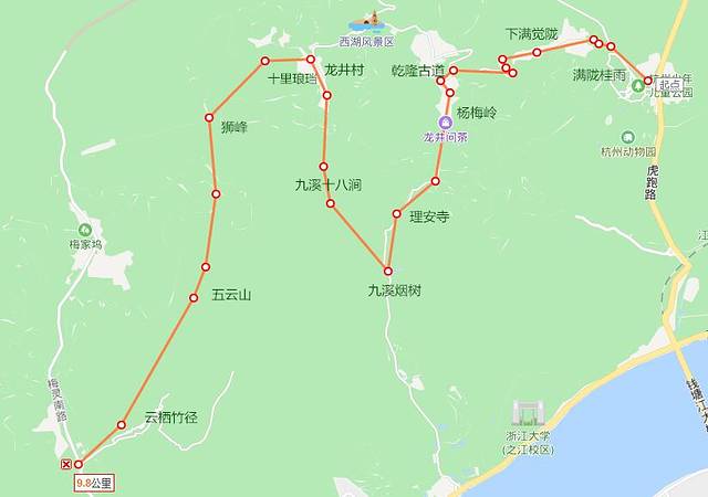 满觉陇—杨梅岭—乾隆古道—九溪烟树—九溪十八涧—十里琅珰—狮峰—五云山—云栖竹径