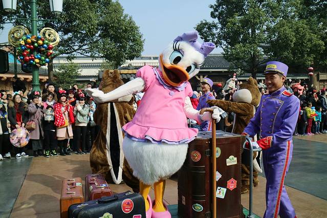 巡游开始,最先经过的是米妮、黛丝和花栗鼠方阵。