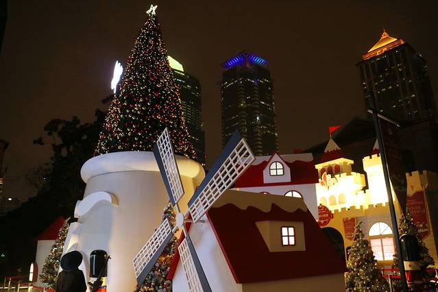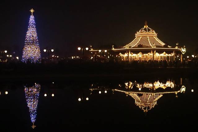 白天游客太多,我们是在夜幕降临后才前往这片热门区域。入夜后,高大的圣诞树和旋转木马倒映在水中,非常梦幻。